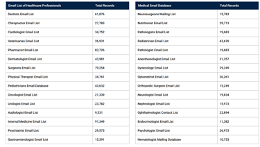 Our healthcare email list is an exclusive resource tailored for professionals across the healthcare sector. Whether you're part of a medical marketing firm, equipment manufacturer, CME provider, medical insurance company, pharmaceutical corporation, or any related entity, our database provides comprehensive contact information for healthcare professionals specializing in various fields.